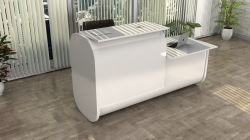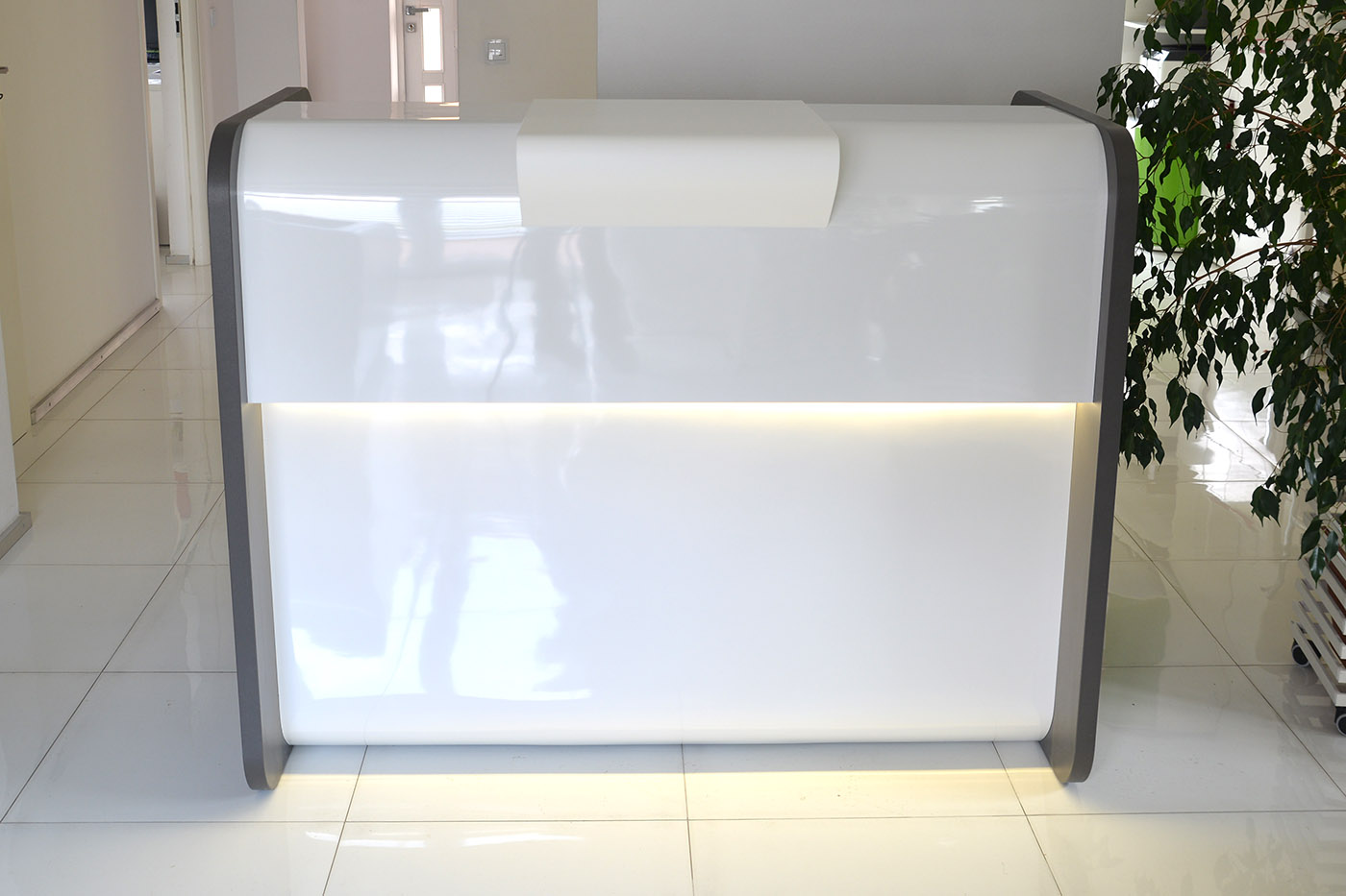 Lada R11 wykonana z laminatu HPL z odpowiednim oświetleniem sprawi że każda użytkowa przestrzeń nabierze nowoczesnej i modnej formy. Piękny „miękki” kształt oparty o zaokrąglone elementy lady przyciąga wzrok użytkowników.