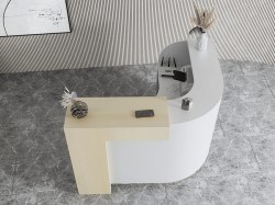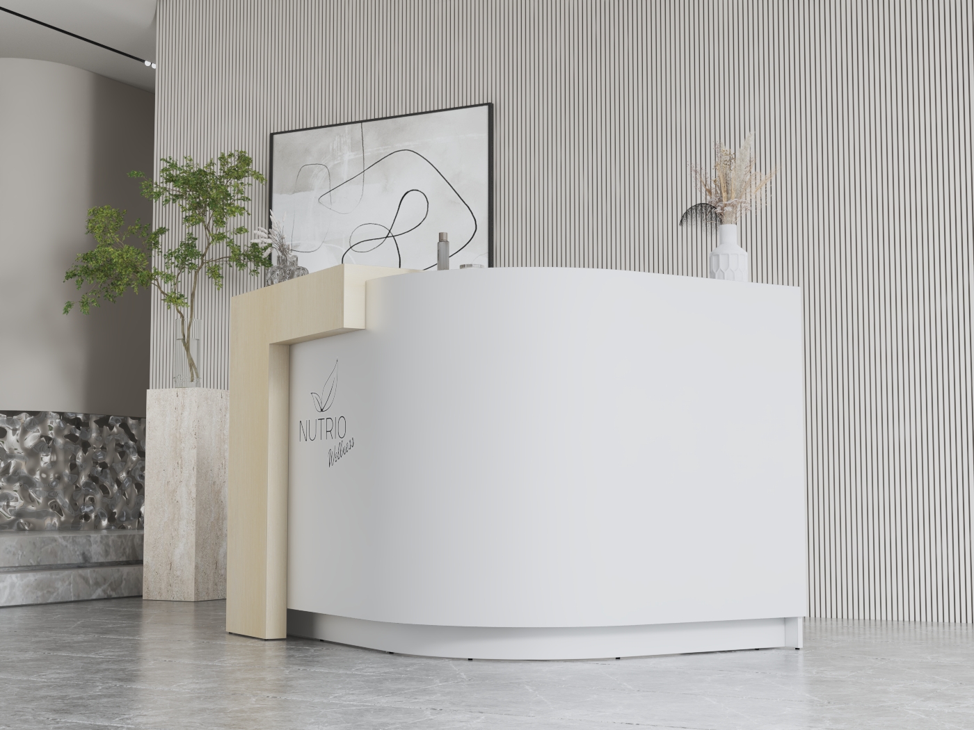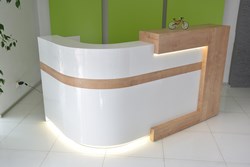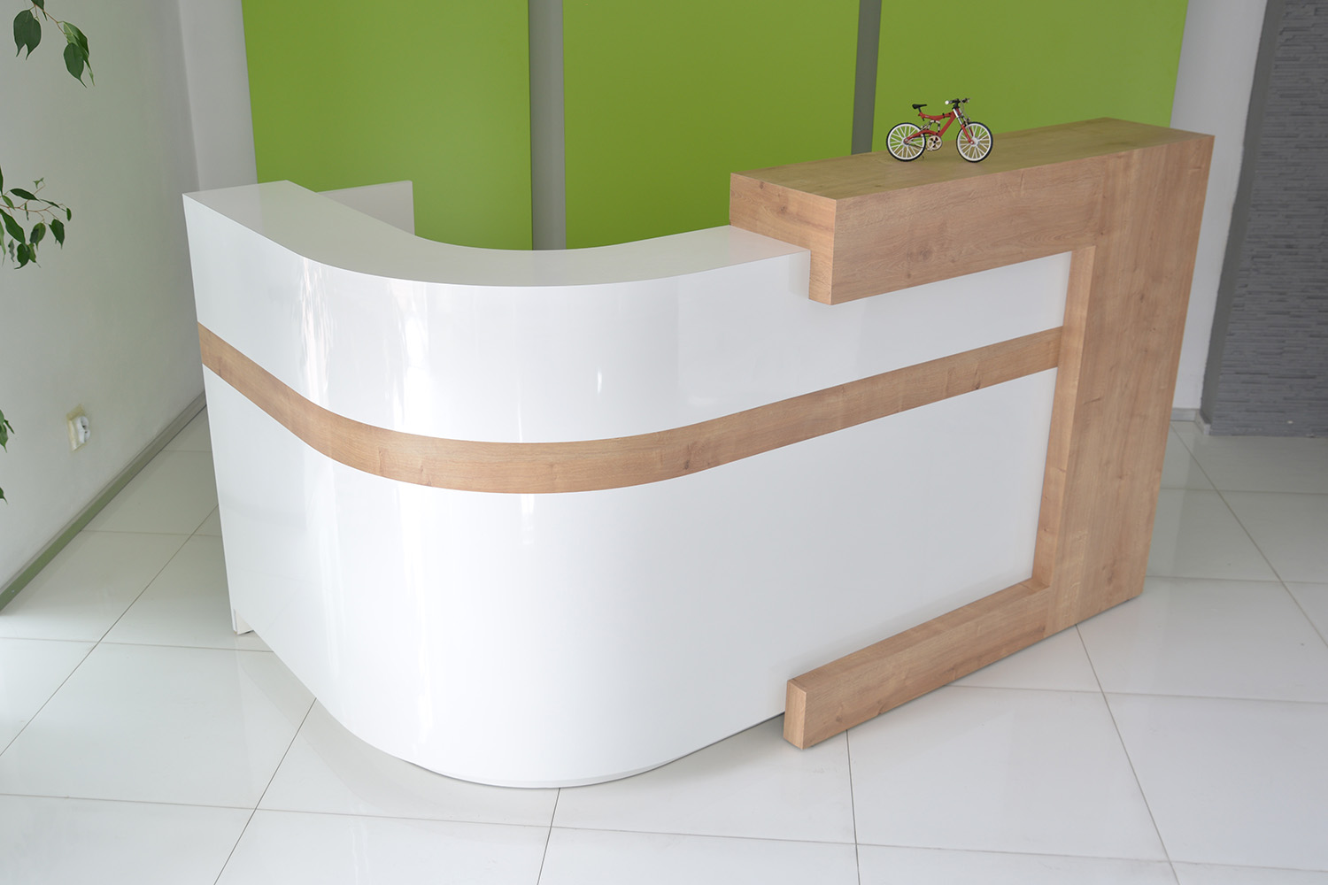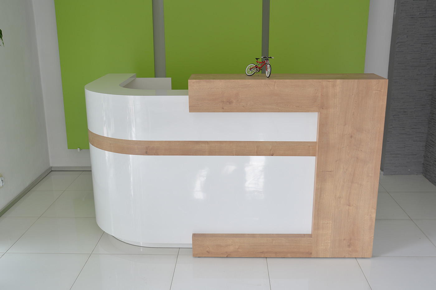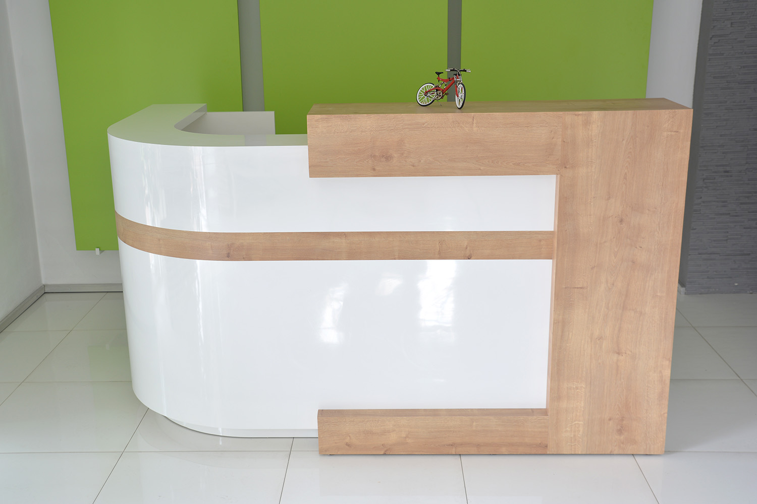 Piękna forma, delikatne rysy lady recepcyjnej R119 to model do firm i kancelarii gdzie subtelnie zaznaczone miejsce obsługi interesanta ma duże znaczenie. Przyjemny kształt, wysoka nadstawka i ciekawa „spinka” na skraju lady w kontrastowym kolorze do frontu zrobi wspaniałe wrażenie na Państwa klientach.
