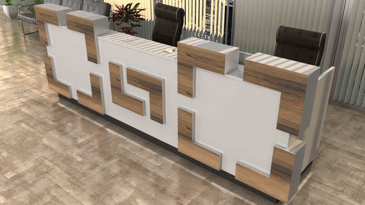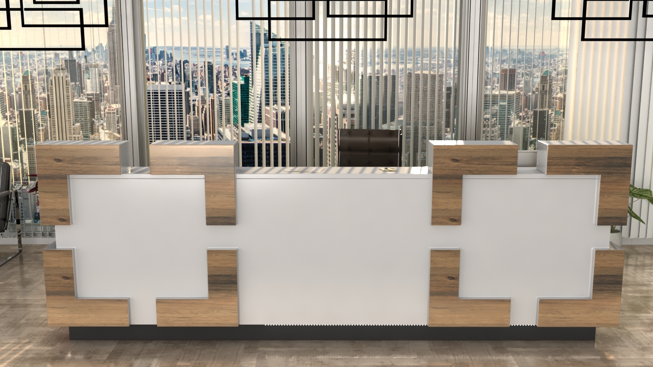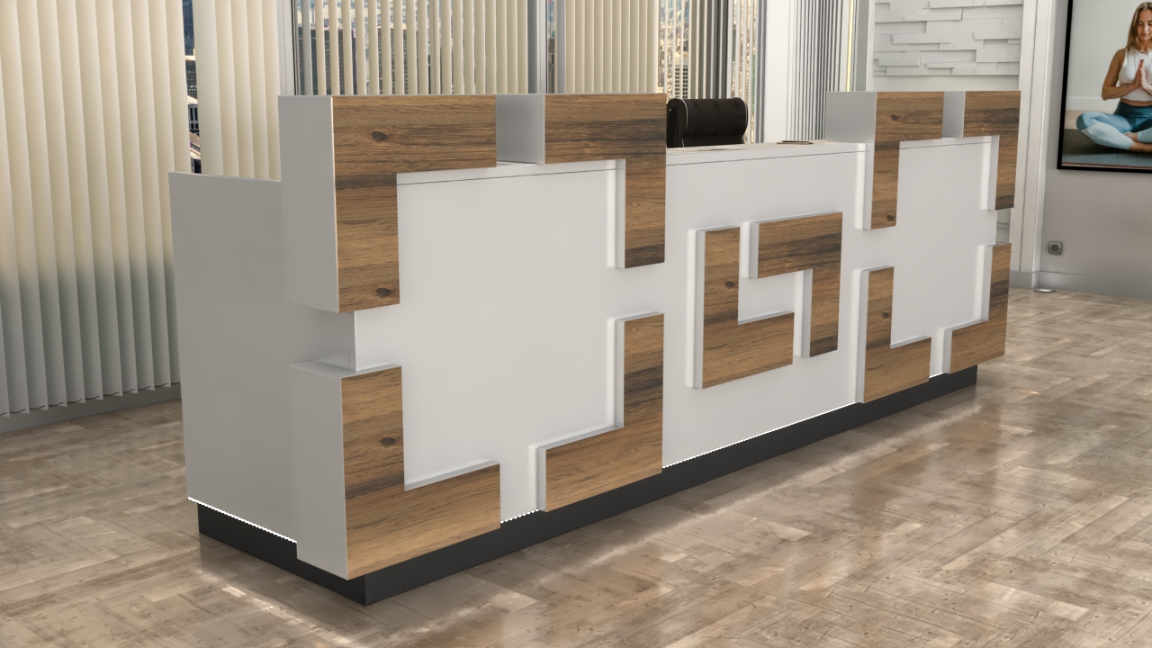 Faktury, kolory i kształty połączono ze sobą w modelu R146. Skrajności i mnoga ilość akcji na froncie tej lady recepcyjnej może być sposobem na wpisani jej w istniejące miejsce docelowe gdzie ma zastąpić inny mebel. Odpowiednio dobrane kształty geometrycznych bloków ozdobnych, kolory nawiązujące do bieżącej architektury oraz możliwość logowania to atuty realizacji R146.