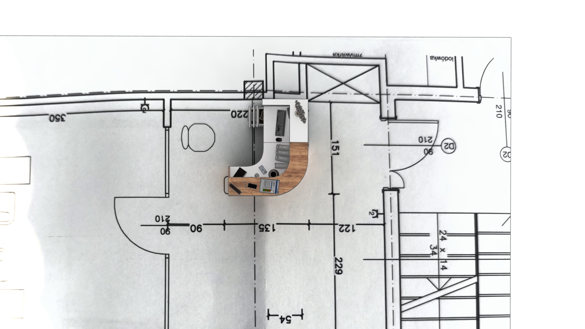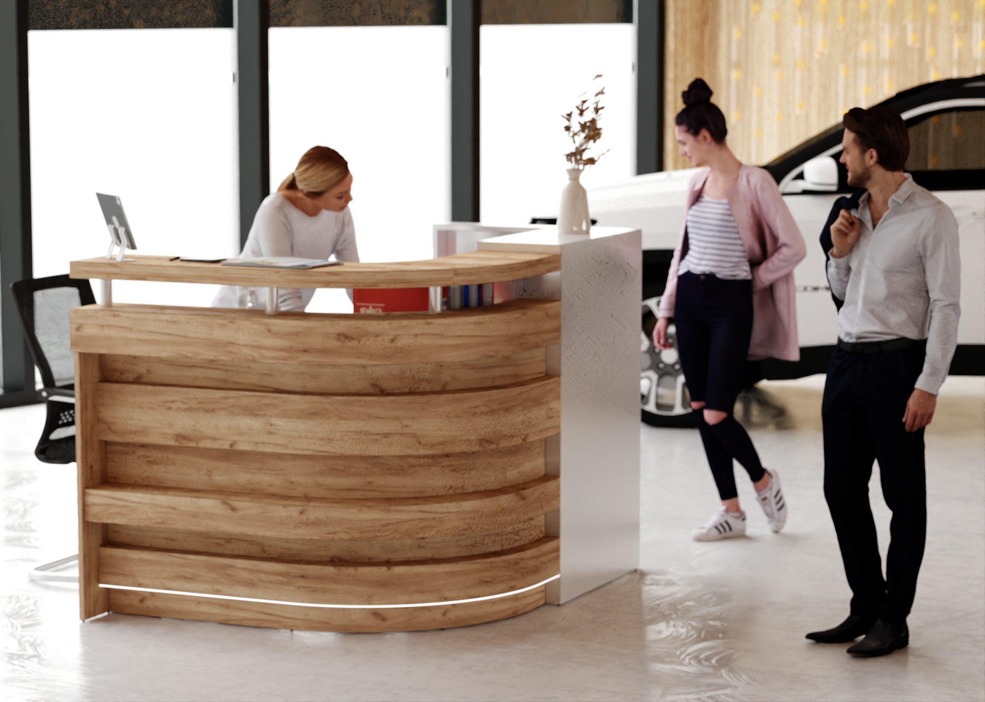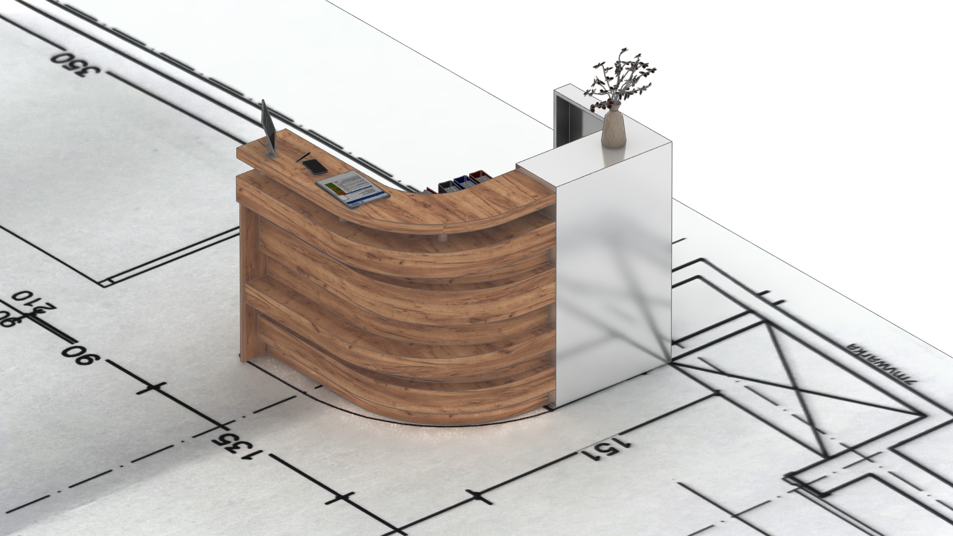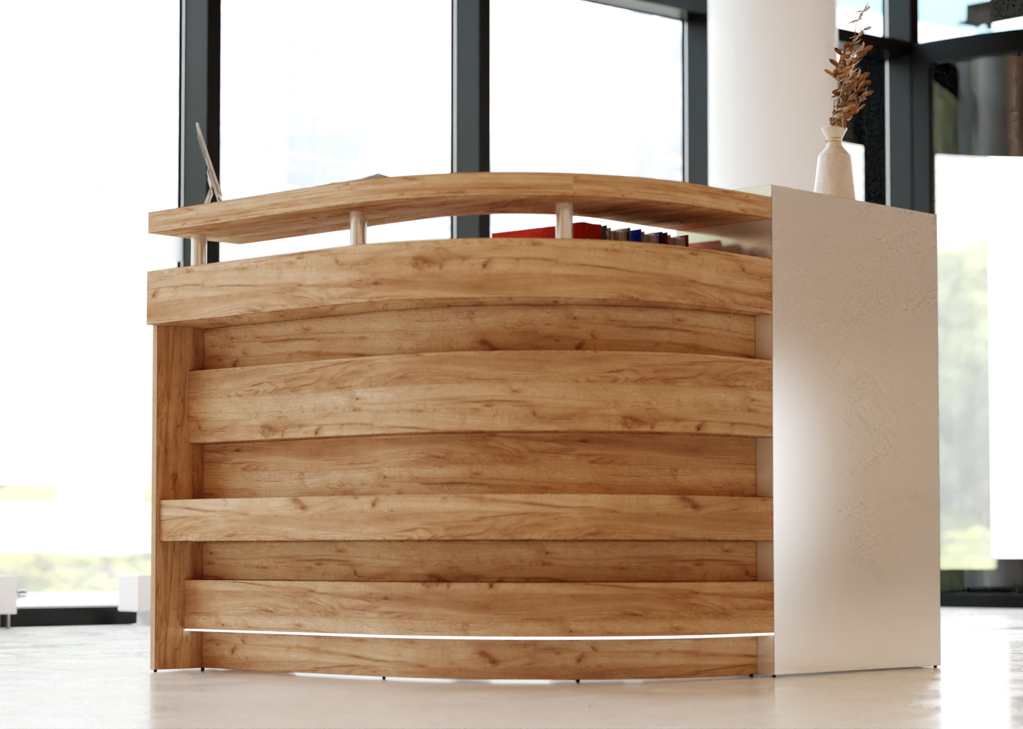 Lada recepcyjna o prostych i eleganckich liniach. Ma ona kształt litery L i składa się z dwóch części: głównej powierzchni roboczej oraz dodatkowej półki na dokumenty.