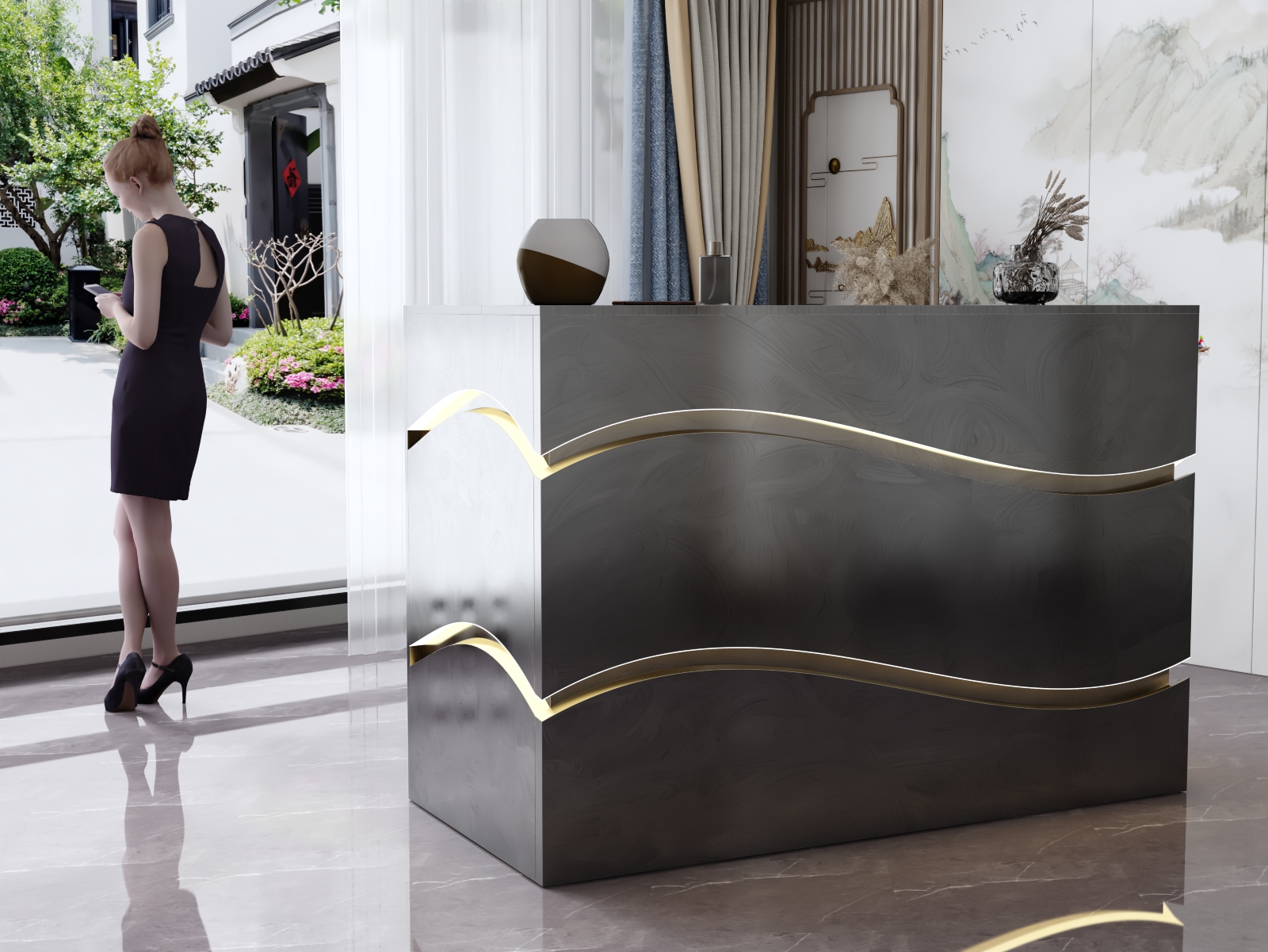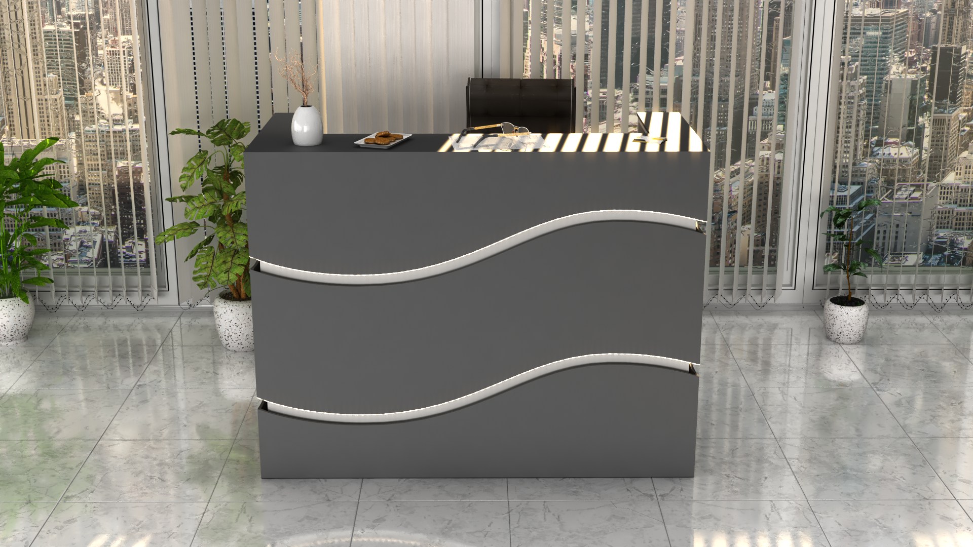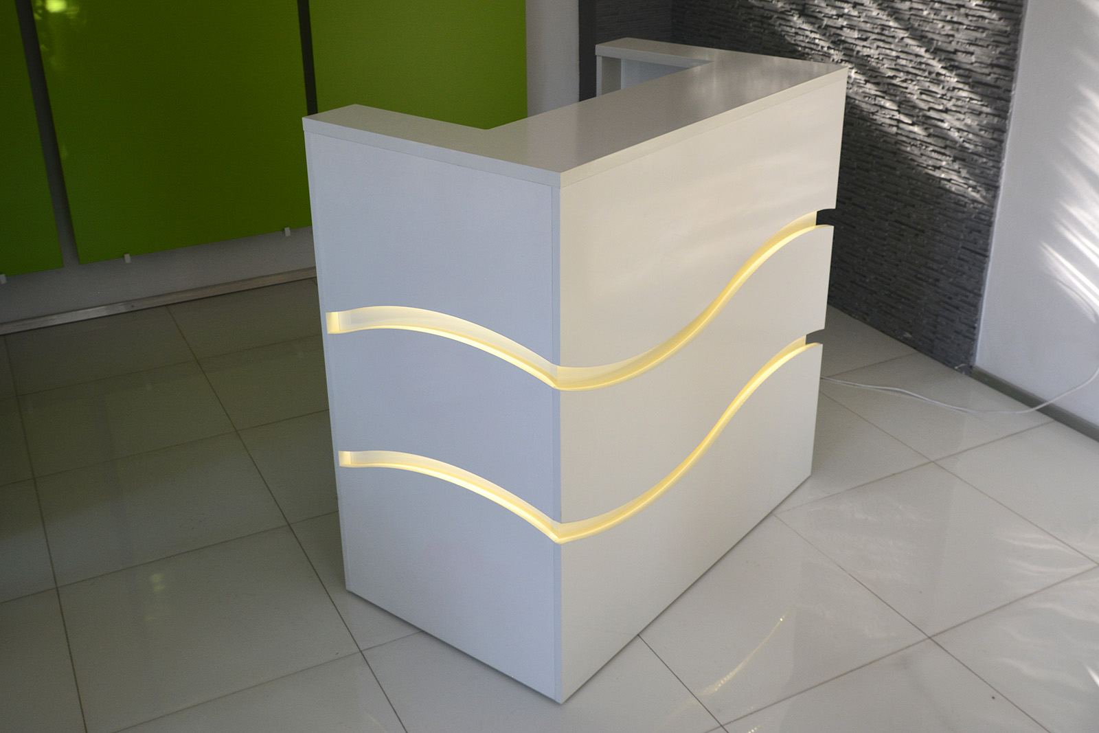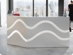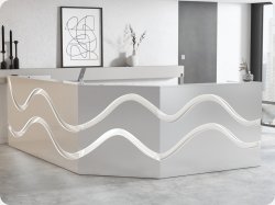 Lada R79 stworzona na bazie lady R1 prosta bryła wyróżnia się jednak bardzo na tle innych recepcji ze względu na piękne cięcia frontu, odpowiednio podświetlone z łagodnym ledowym światłem tworzą spójną, nowoczesną całość.