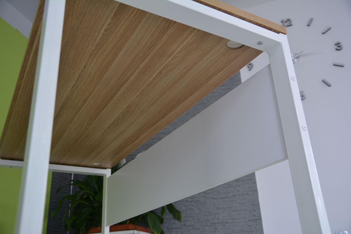 Desk legs are made of metal frame in the metallic color, equipped with the regulated furniture feet in case of an uneven ground.