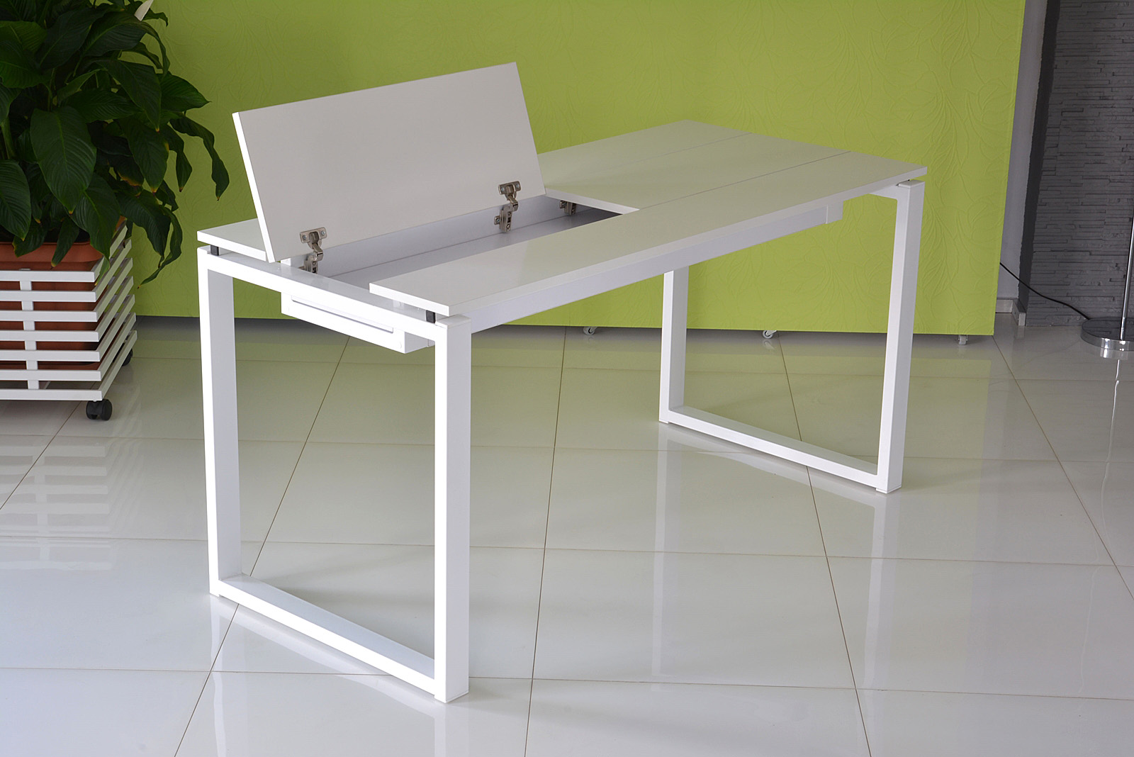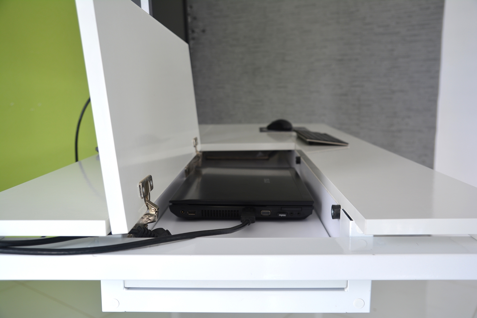 The Q9 module furniture system is a complete workplace amenities. The Q9 desk is equipped with a hidden shelf for a laptop computer, cables, chargers, etc. (organizer). Due to the hidden shelf we save a lot of space.