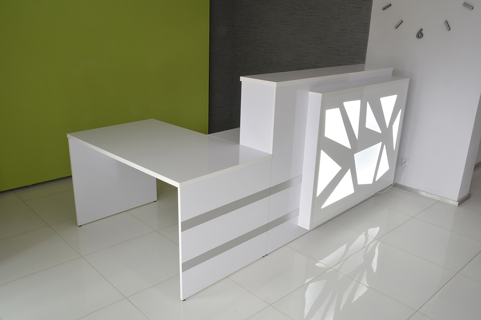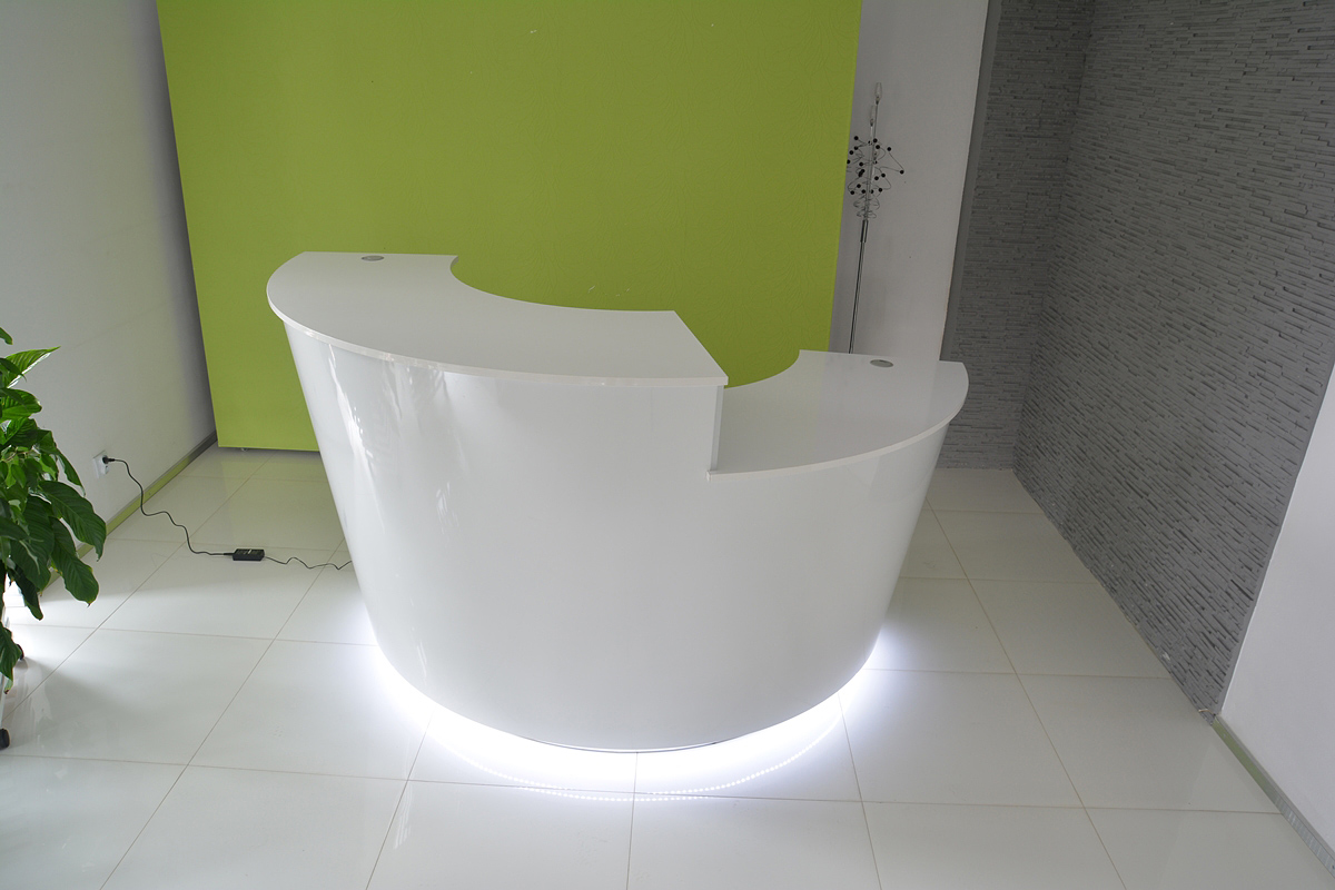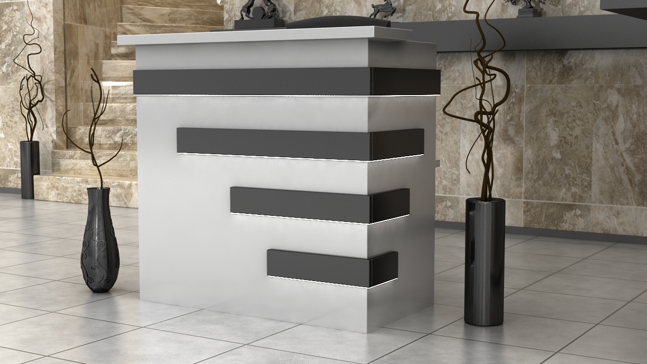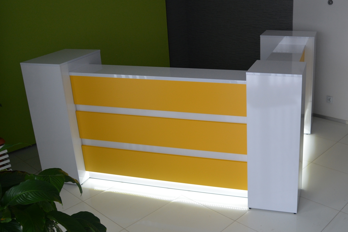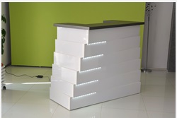 From the inside, the reception counter can have any setup (drawers, shelves, etc.) The final price is fixed individually and depends on the equippement, materials that were used and the size. Reception counter's front is lighted with LED lights ( optionally the upper countertop can be lighted as well)