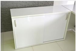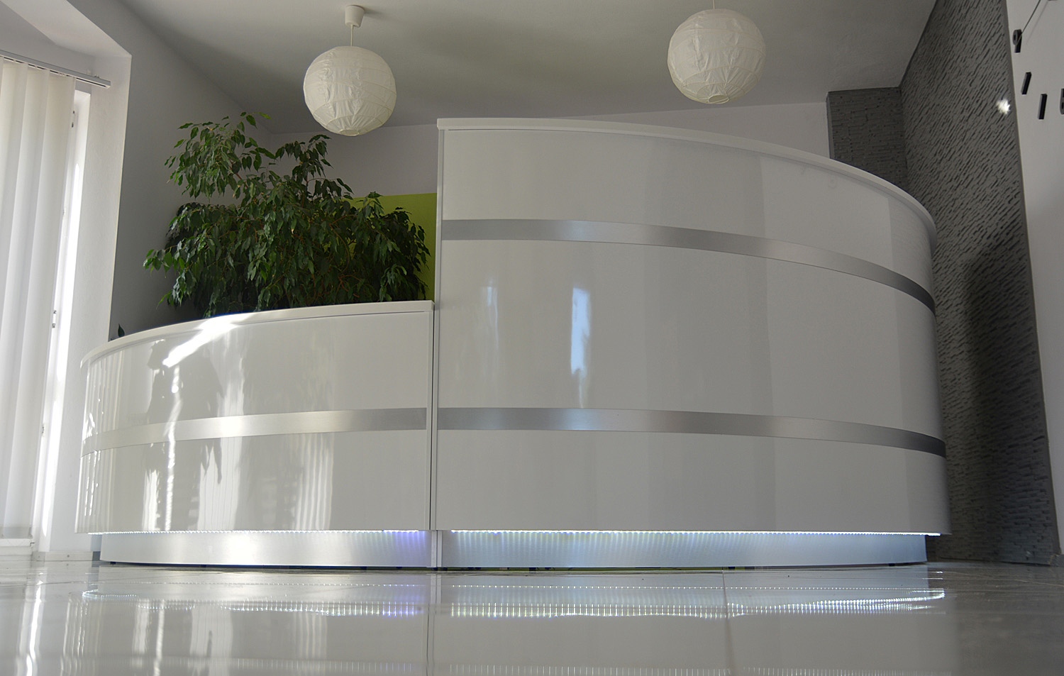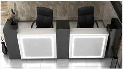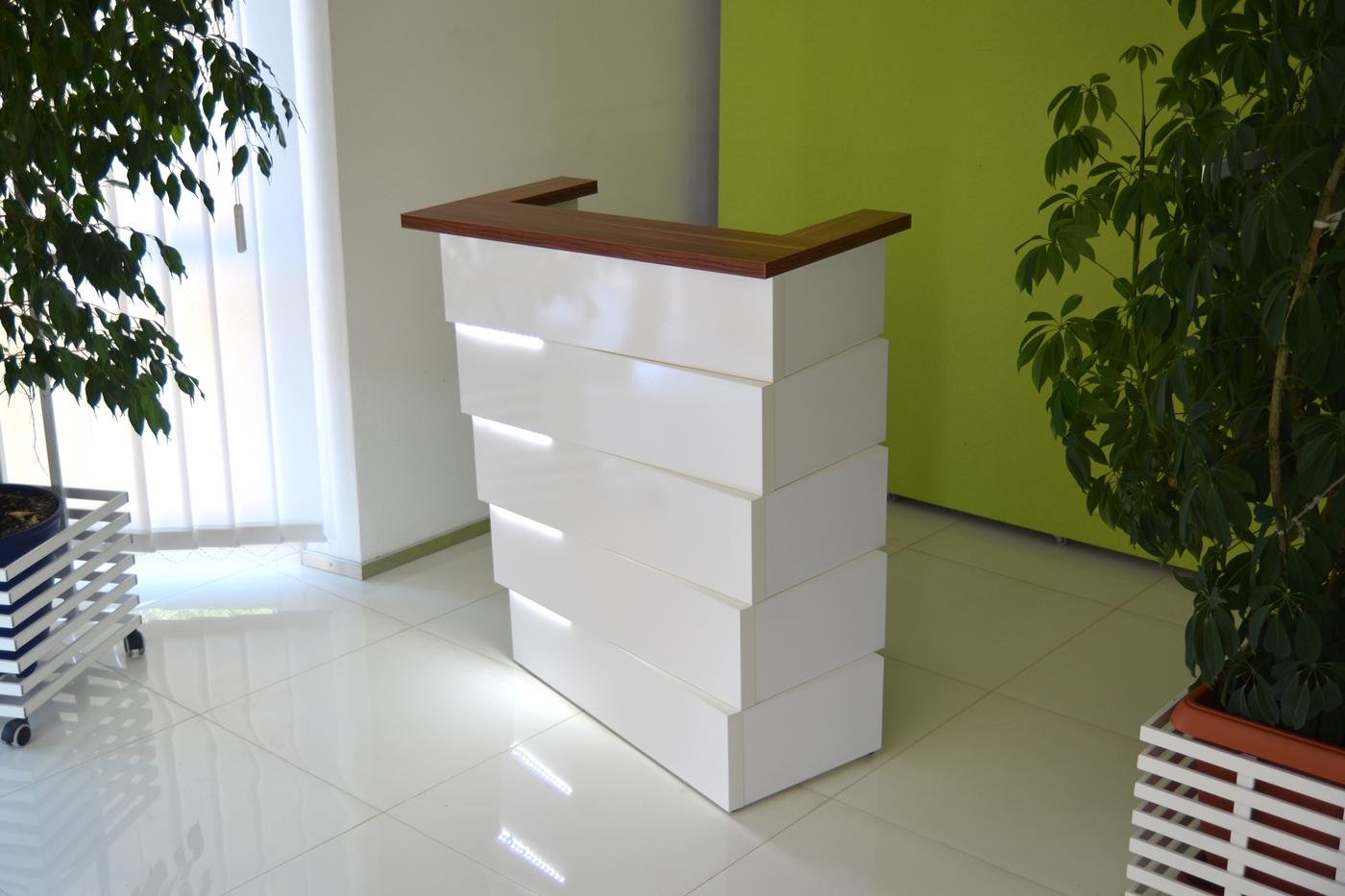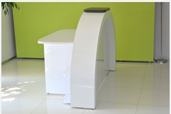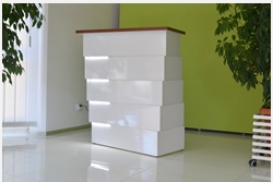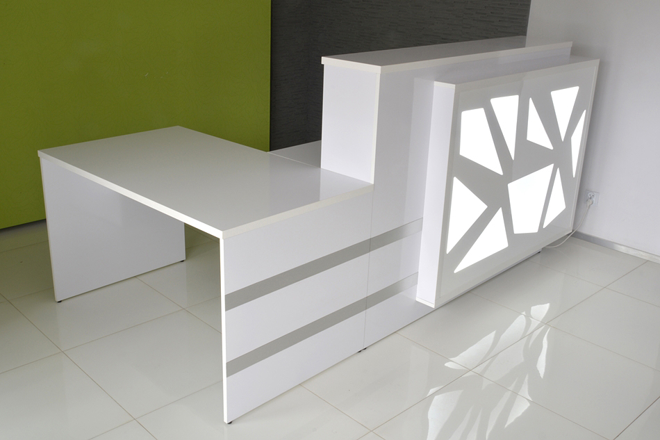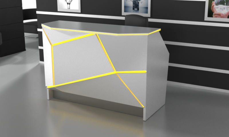 From the inside, the reception counter can have any setup (drawers, shelves, etc.) The final price is fixed individually and depends on the equippement, materials that were used and the size. Reception counter's front is lighted with LED lights ( optionally the upper countertop can be lighted as well)