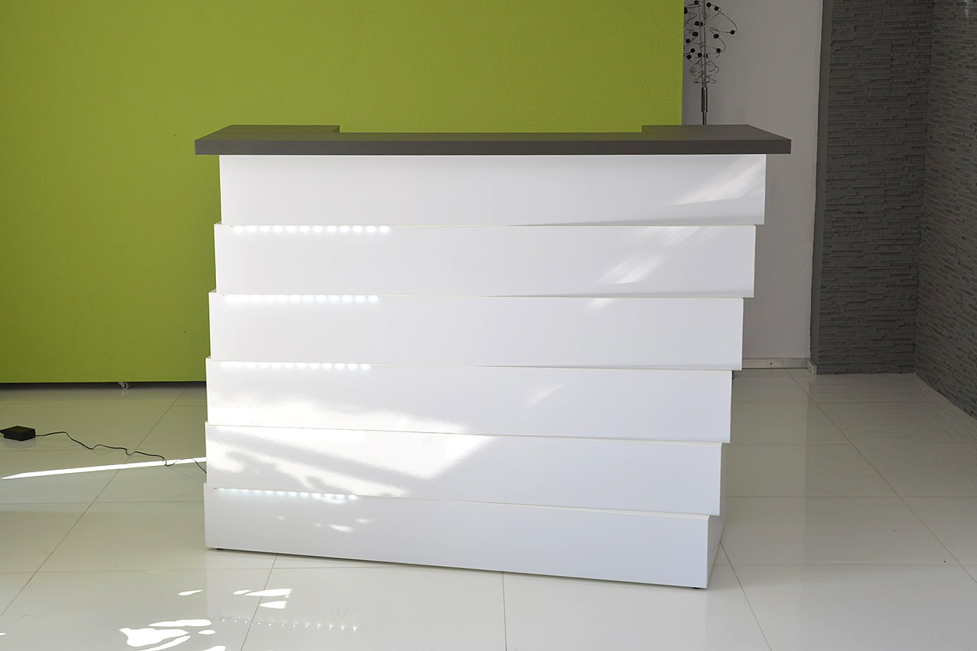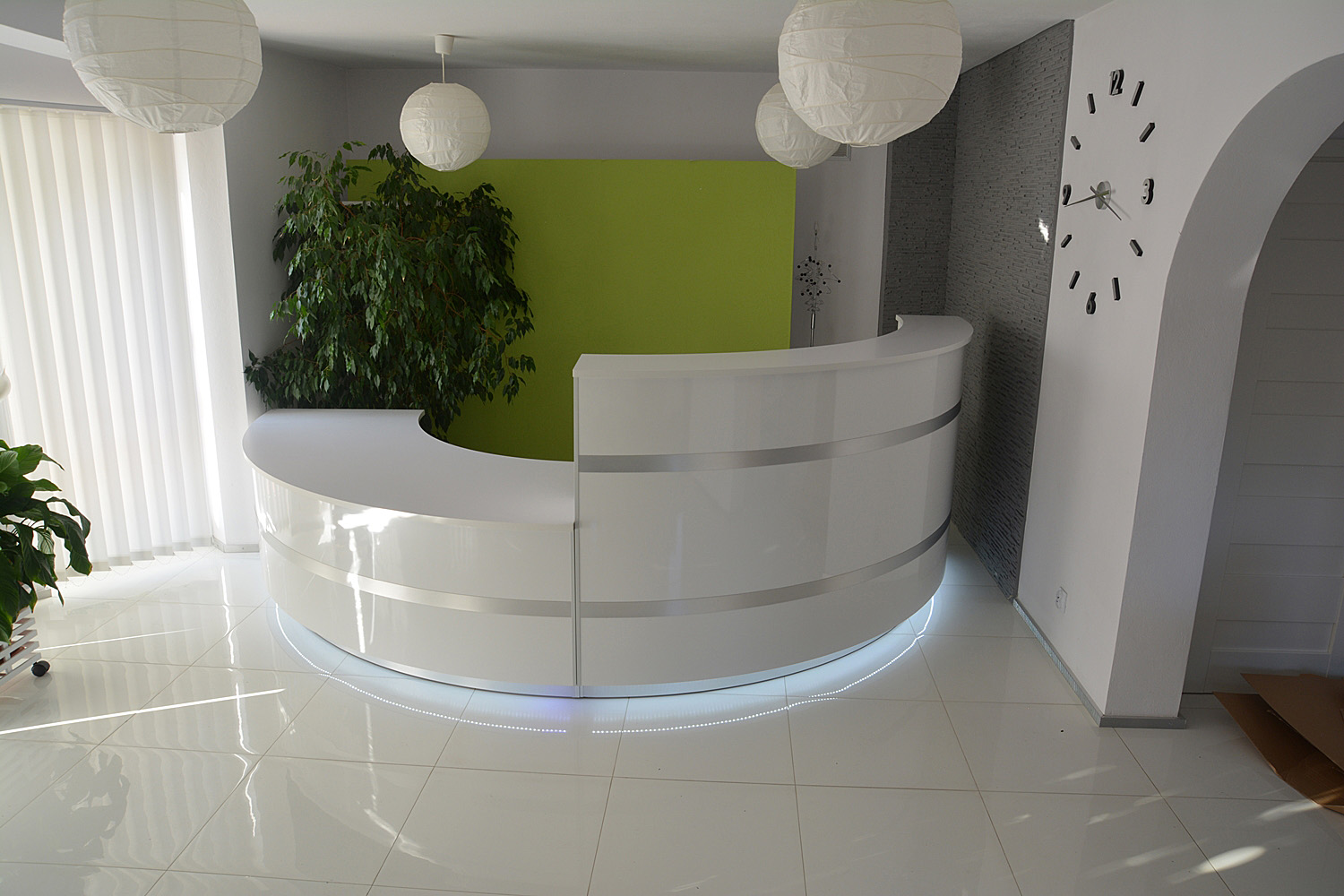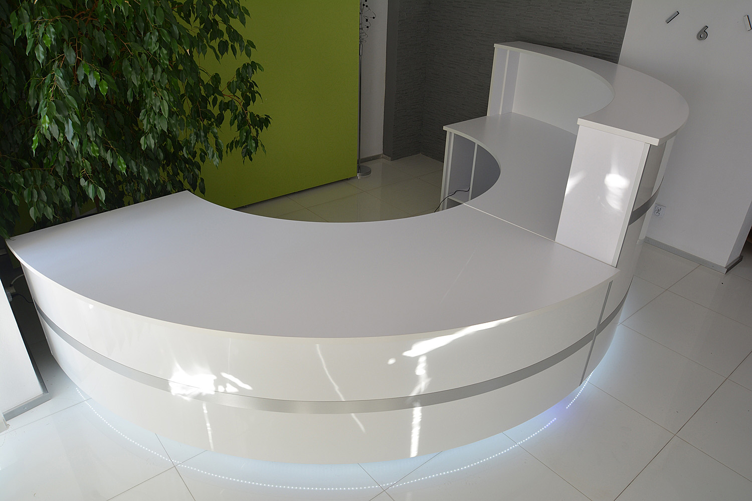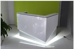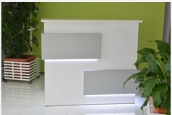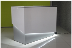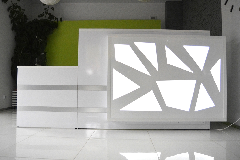 From the inside, the reception counter can have any setup (drawers, shelves, etc.) The final price is fixed individually and depends on the equippement, materials that were used and the size. Reception counter's front is lighted with LED lights ( optionally the upper countertop can be lighted as well)