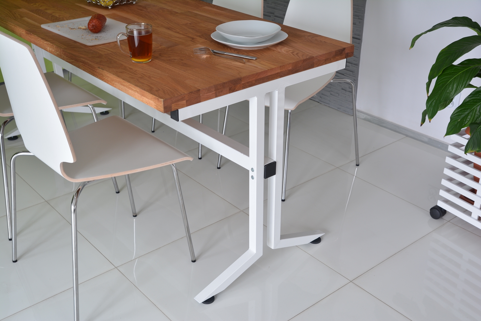 Stół wykonany z najwyższej jakości materiałów. Blat stołu wykonany z naturalnego drewna dębowego, które może występować w wersji olejowanej lub lakierowanej . Stelaż stołu wykonany z profila metalowego malowanego proszkowo na kolor biały, srebrny lub czarny.