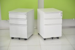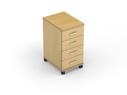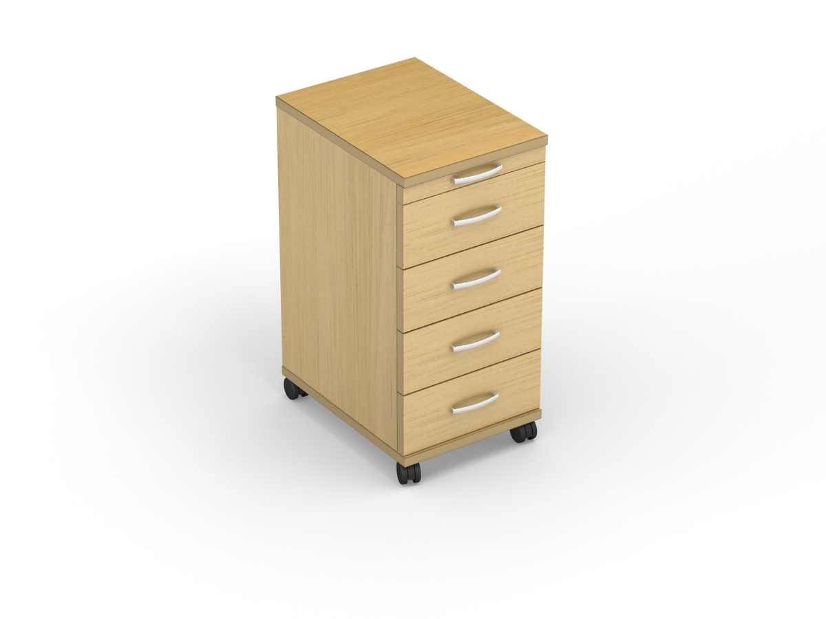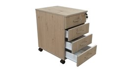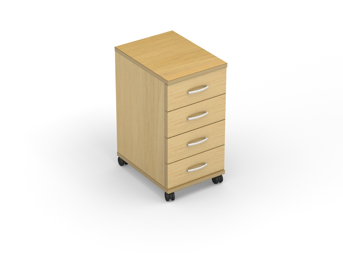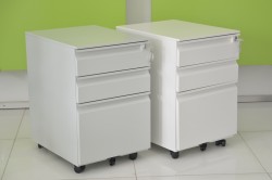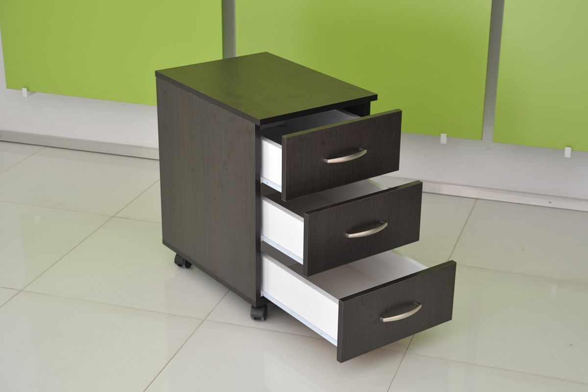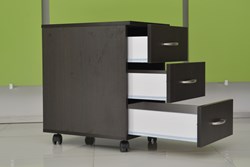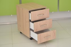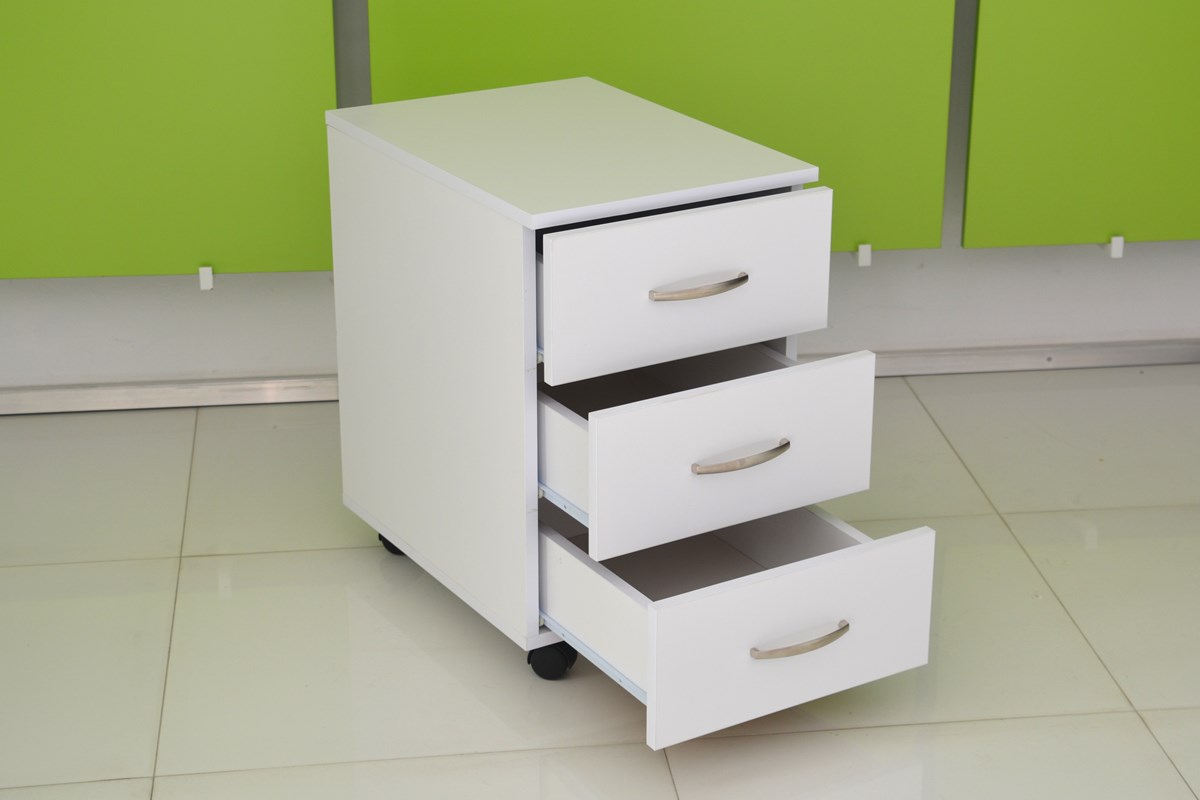 Kontenerek w całości wykonany jest z solidnej blachy 0,8 mm malowanej proszkowo, front podzielono na 2 płytsze szuflady w tym wkład piórnikowy na drobne elementy oraz 1 głęboką szufade umożliwiającą przechowywanie kartotek, teczek czy innych gabarytowych przedmiotów.