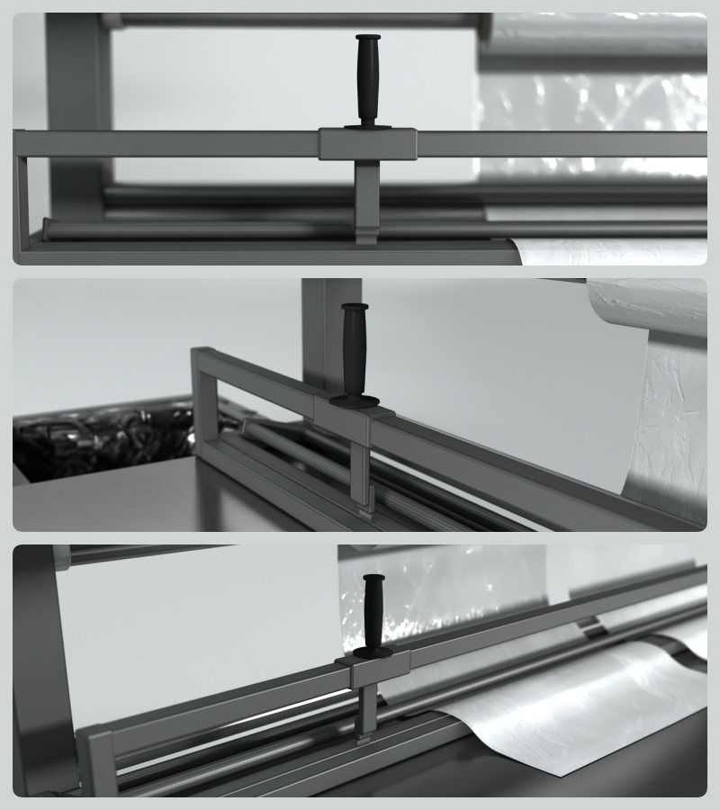 Dowolna zabudowa półki , oświetlenie , szafki , szuflady , przeloty kablowe , stopki , kółka, przesuwane przegrody, nóż do foli .