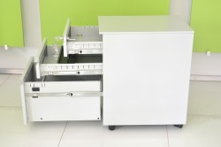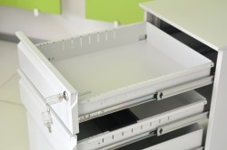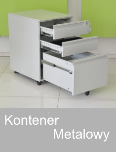 Kontenerek w całości wykonany jest z solidnej blachy 0,8 mm malowanej proszkowo, front podzielono na 2 płytsze szuflady w tym wkład piórnikowy na drobne elementy oraz 1 głęboką szufade umożliwiającą przechowywanie kartotek, teczek czy innych gabarytowych przedmiotów.